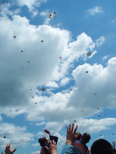 良いお天気に恵まれました。 いい風が吹いて、初凧は元気に大空を舞いました。 謙太くんも、お父さんお母さんと一緒にがんばりました! |