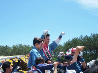 こちらは10帖凧の凧揚げです。 風が強く、なかなか苦労しました。 勇心くん仁くんの晴れやかな顔を見て下さい! |